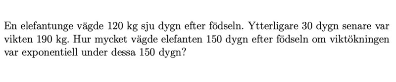 Jag känner att jag behöver ta reda på förändringsfaktorn, hur mycket vikten ökar per dygn. Men jag vet inte hur. Ett exempel är kanske, 70/30= 2,3333 ---> 2,33 x 150 dygn.... 349,55 kg vägde elefanten efter 150 dygn. men jag menar, då använder jag ju inte exponentialfunktionerna och då borde detta svaret bli fel?