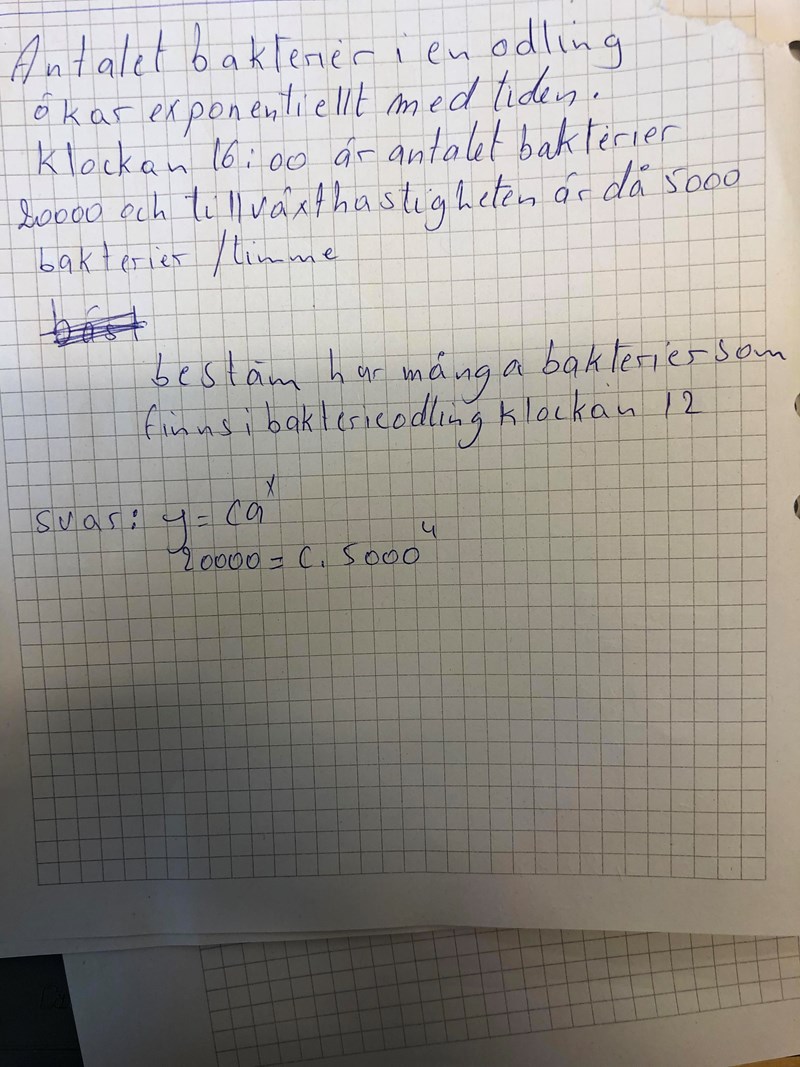 Du börjar bra dvs din funktion är y= ca^x. Sedan har du informationen att kl 16.00 är antalet bakterier 20000. Nu måste vi hitta en nolltidpunkt och 16.00 kan lika gärna vara det. Då har vi att y(0) = 20000. Detta ger oss C i vår ekvation