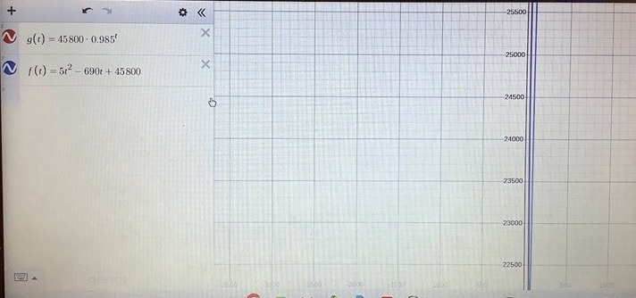 Skriv istället in y = 5x22-690x+45800 och y = 45800*0,985x.