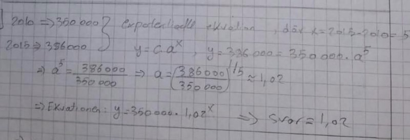 Detta visar hur viktigt det är att berätta vad alla variabler betyder. Jag skulle ha skrivit formeln som y = 350at där a är förändringsfaktorn och t är tiden efter 2010 och antalet invånare anges i tusental invånare.