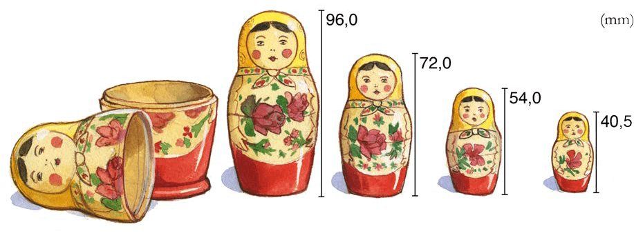 Andreas har en uppsättning ryska dockor. Höjden på hans minsta dockor visas nedan. Förhållandet mellan dockornas höjd är lika.