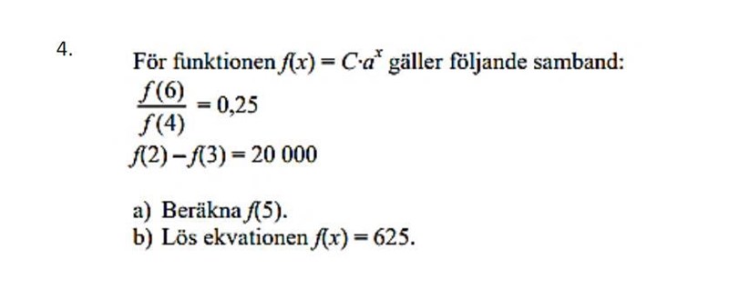 Börja med att hitta ett uttryck för f(6) och f(4), samt f(2) och f(3). f(6) betyder "Vilket värde har funktionen f då x = 6?". Om vi sätter in x = 6 i funktionen får vi att . Utan vetskap om C:s eller a:s värde kan vi inte hitta ett exakt värde just nu, men det är ändå värdefullt. Kan du göra något liknande för f(2), f(3) och f(4)?