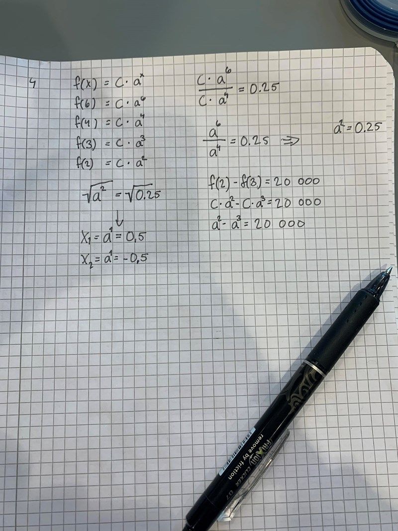 Eftersom vi från början inte vet C och a kan vi inte beräkna t.ex. f(6) exakt, men vi kan ändå sätta in x=6 i funktionen och få ett uttryck att byta ut det lite anonyma "f(6)" mot. Prova att göra det, och sen samma sak med f(4). Om allt går vägen så blir f(6)/f(4) = 0.25 plötsligt en lösbar ekvation.