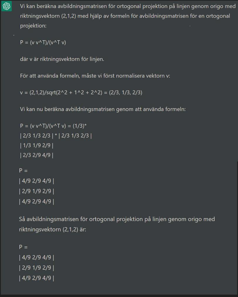 Vilket är rätt svar, men jag känner inte igen formeln P = (v v^T)/(v^T v). Finns det något annat sätt att lösa denna uppgift som är mer anpassat efter min kunskapsnivå (linjär algebra Jonas Månsson) eller är det den formeln som man ska använda sig av?
