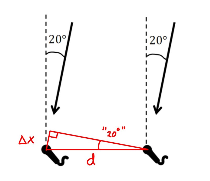 Från den avlägsna källan så är det en extra sträcka d*sin(20°) till den vänstra mikrofonen. Bilden är inte skalenlig.