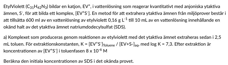 2. Sen fastnar jag. Molförhållandet mellan S- och EV+S- (aq) är ju 1:1 så S- borde ha samma konc som EV+S- (aq) EFTER extraktionen. Detta säger dock inte hur mycket SDS som måste adderas? Så jag vet inte hur jag ska svara på frågan?