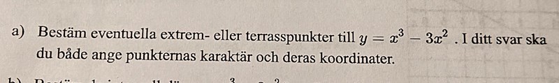 Janne491 skrev:Ok, extrempunkter är ju max- och minvärden för funktionen. I max och minpunkter är derivatan noll. I en terasspunkt är derivatan också noll, men det är varken max eller minimum