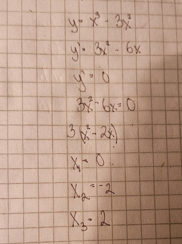 uttrycket för derivatan = 0 är ju en andragradsekvation, men du har fått tre rötter. Det ska bli två rötter. Lättast är om du bryter ut x: y´ = x(3x - 6). Då ser du att en av rötterna är noll och en är 2. -2 är ingen lösning