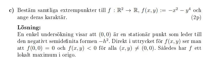 ex. f(0,1) = 0 och f(x,y) < 0 för alla (x,y) != (0,0) . Därav inget lokalt maximum känns mer logiskt för mig, missar jag något eller kan det vara ett fel i facit?