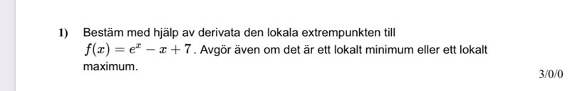 Du har tagit reda på för vilket x-värde derivatan är 0. Det är en bra start (du behöver det för att kunna lösa uppgiften). Du vet alltså x-värdet för den lokala extrempunkten. Vilket y-värde har den?