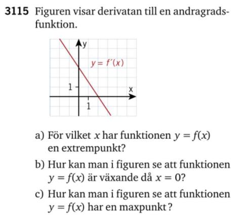 Hej! jag förstår verkligen inte denna uppgift. Hur kan man följa f(x) genom grafen för f'(x)? Detta är väl bara tangenten för en punkt? Om den är en graf för hela f(x) så förstår jag inte hur jag ska läsa av den :(