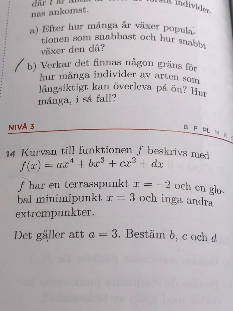 Hej! Det verkar som om jag har rört ihop olika sorters punkter. Jag tänkte att derivatan ska vara 0 i dessa extrempunkter och försökte räkna på det. Jag tänkte även att andraderivatan skulle vara lika med 0 för terasspunkten, men allt blev fel. Så hur man kan tänka? Varför kan man inte göra så som jag gjorde? Var blir det fel?