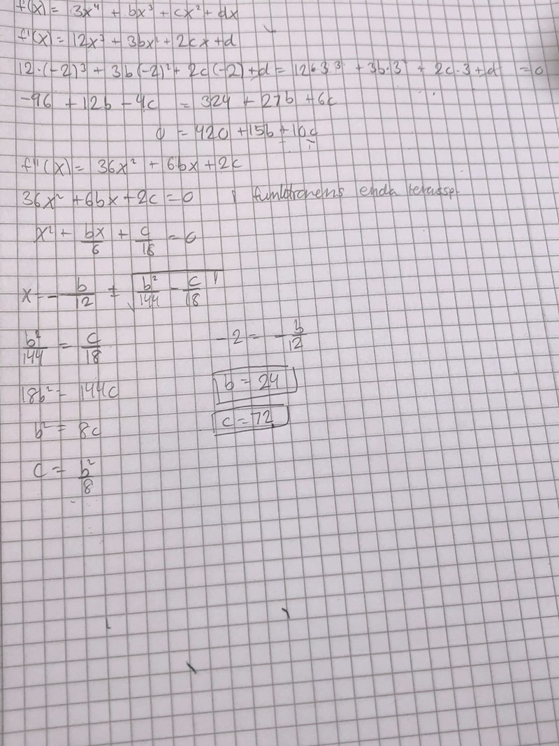 Gör istället så att du sätter upp ekvationerna f'(-2) = 0, f'(3) = 0 och f''(-2) = 0.
