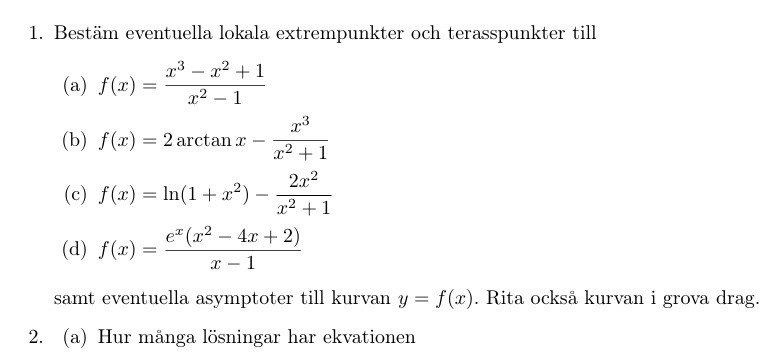 f'(x) = (-x^4 - x^2 + 2) / (x^2 + 1)^2. På första uppgiften var det enklt att rita grafen och avgöra samtliga extrempunkter, här blir det lite grisigt. Ska man derivera en gång till?