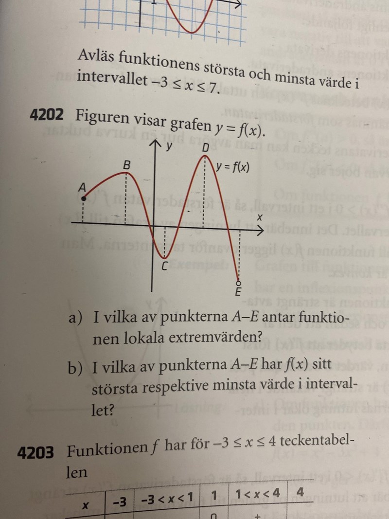 Hmm.. Punkten E ingår ju inte i definitionsmängden. Så av de angivna punkterna har C minsta värde.