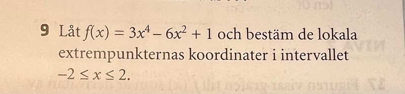 Hej! Har lite svårt att förstå varför punkterna (-2,25) samt (2,25) blir maximipunkter. När jag använder andraderivatan får jag funktionen 36x^2-12, vilket om jag sätter in -2 och 2 antar ett positivt värde vilket ger en minimipunkt. Tänker jag fel? Ska man tänka på annat sätt om man räknar på ”ändpunkterna”?