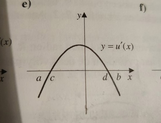 Jag tänker att lokal max är punkten c, då kurvans lutning>0 och lokal minimum är d, då lutningen är <0 . A och b är ju inte definierade. Men i facit står det att d är lokal max och c är lokal min! Kan någon hjälpa mig med vad jag missar?