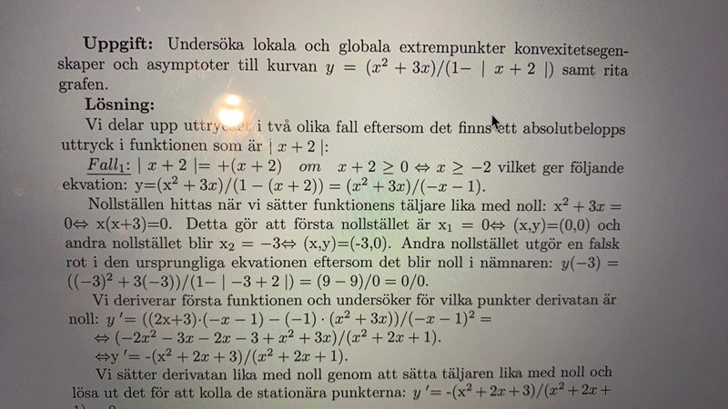 Ser att du börjat undersöka lokala extrempunkter med derivata. Kanske har du gjort färdigt längre ned som inte syns i bilden. Är det de globala extremvärdena du söker? I så fall bör du titta dels på de punkter där y inte är deriverbar (=där absolutbeloppet byter från + till -) och dels vad som händer när x går mot + oändligheten och - oändligheten.