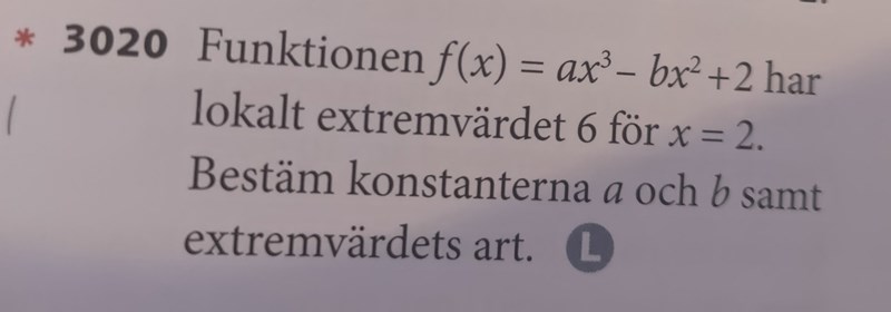 Dr. G skrev:Extremvärde betyder här funktionsvärde i en (lokal) extrempunkt, mer specifikt f(2) = 6.