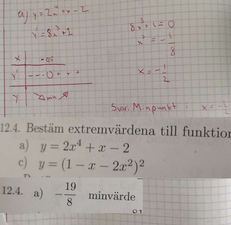 Bestäm extremvärdet till funktionen . Bestäm också, om de är max- eller minvärde.