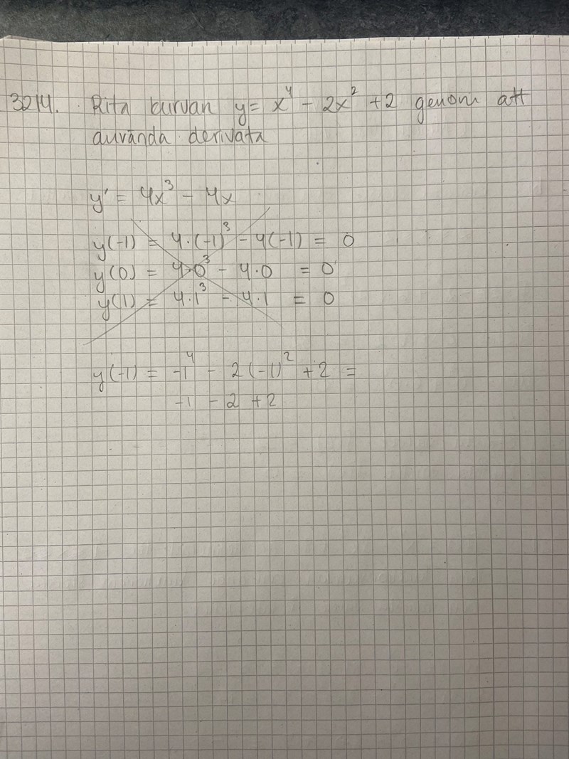 Hitta nollställen till derivatan är väl en bra idé (men skriv y'(-1) osv., inte y(-1)).