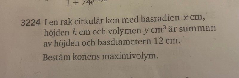 I en rak cirkulär kon med basradien x cm, höjden h och volymen cm³ är summan av höjden och basradien 12 cm. Bestäm konens maximivolym.