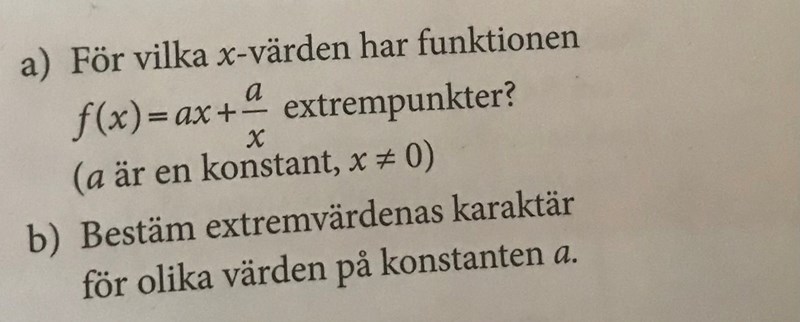a) har löst genom att derivera funktionen, fick f’(x)= a - a/x^2