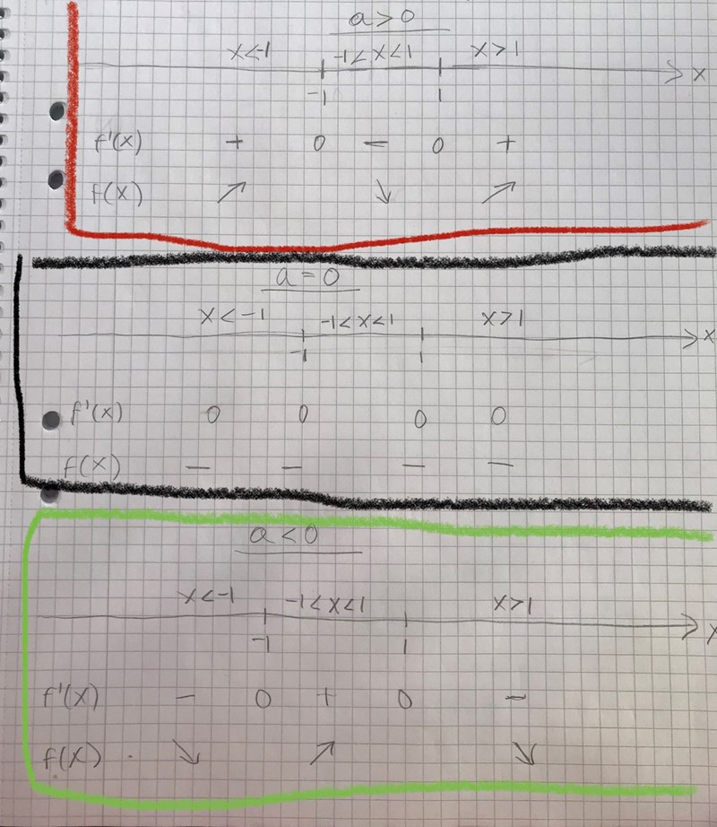 Ja, teckenstudien gav mig informationen att när a>0 får man en maximipunkt i (-1,-2a) och minimipunkt i (1,2a). Och när a<0 minimipunkt i (-1, -2a) och maximipunkt i (1,2a).