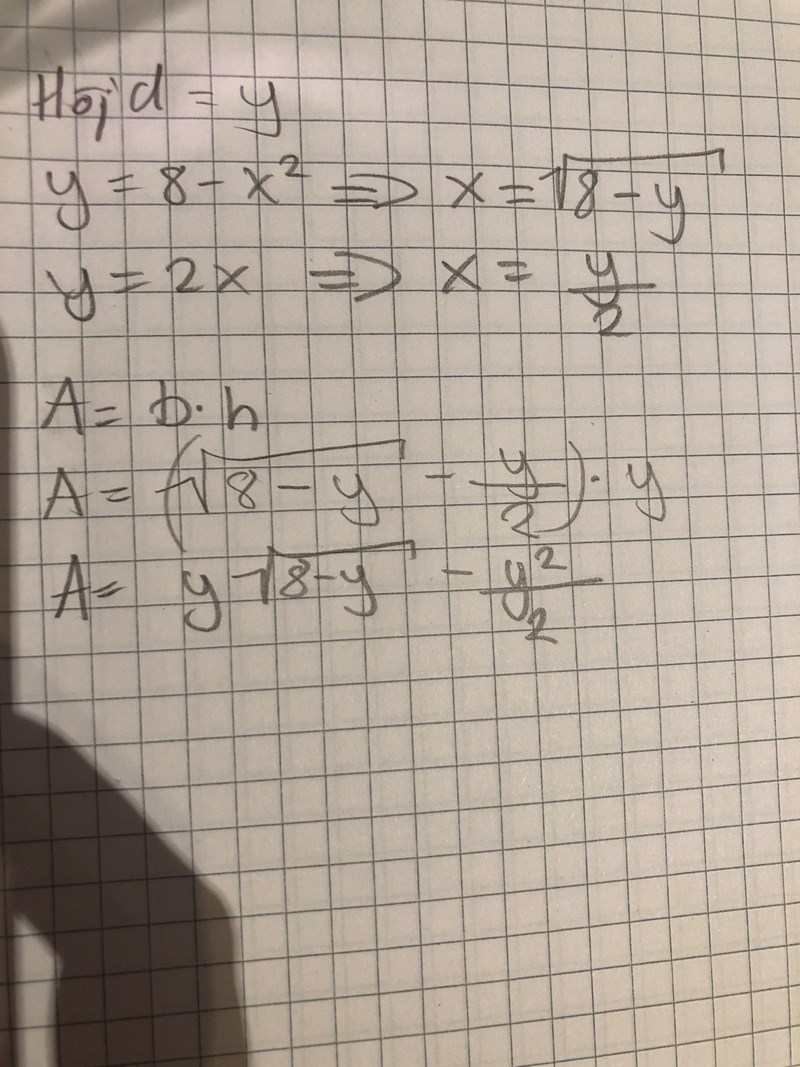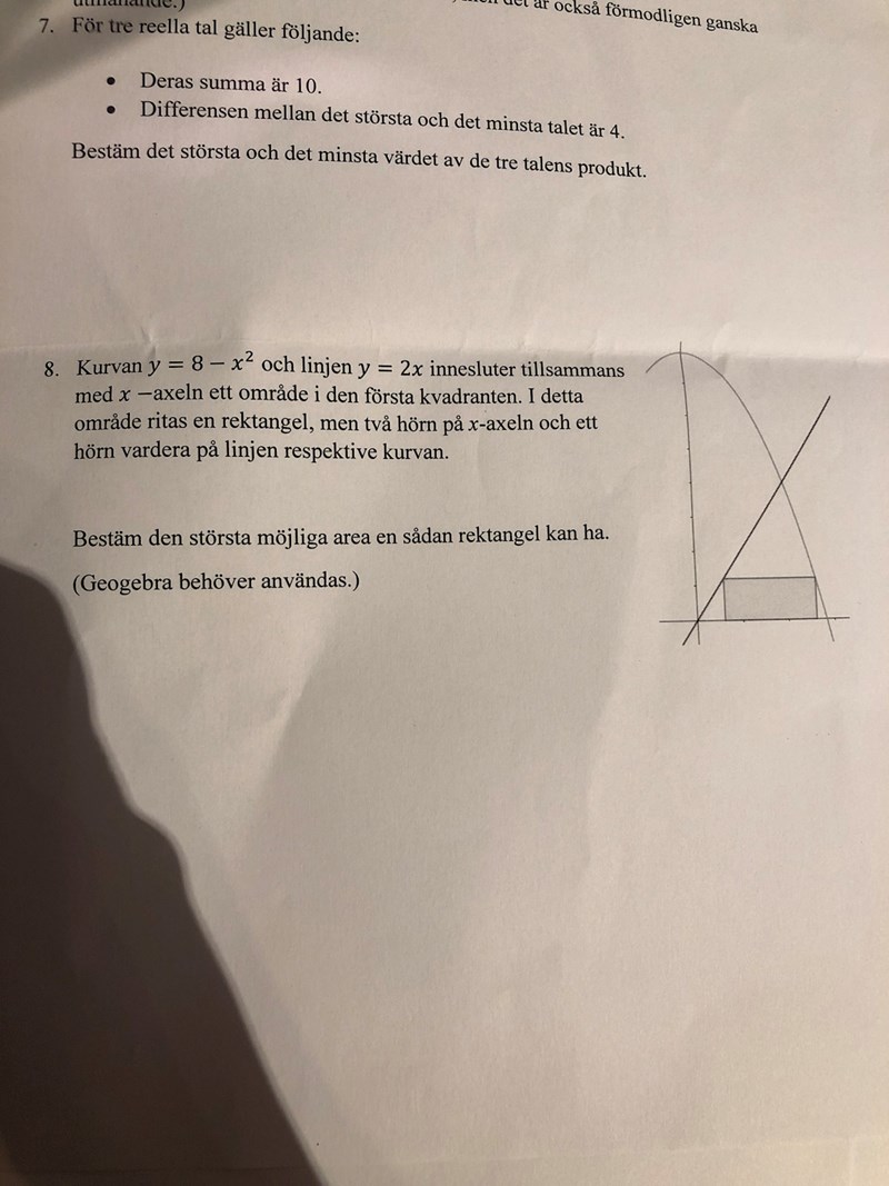 Har lite problem med denna uppgift. Har klurat ut att A=bh, h=y=8-x^2 och att de skär i varandra då x=2. Vet inte hur jag får fram b men vet hur jag ska lösa uppgiften efter det. Har inte direkt kommit längre och förstår inte vad man ska använda geogebra till, i detta fall. Tack på förhand :))