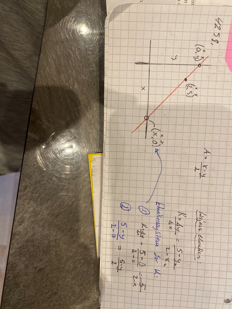 Det är samma linje, så det är samma kk, så 52-x=5-y2\dfrac{5}{2-x} = \dfrac{5-y}{2} gäller. Från detta samband kan du lösa ut en av variablerna, t.ex. y=5-102-xy = 5 - \dfrac{10}{2-x}.