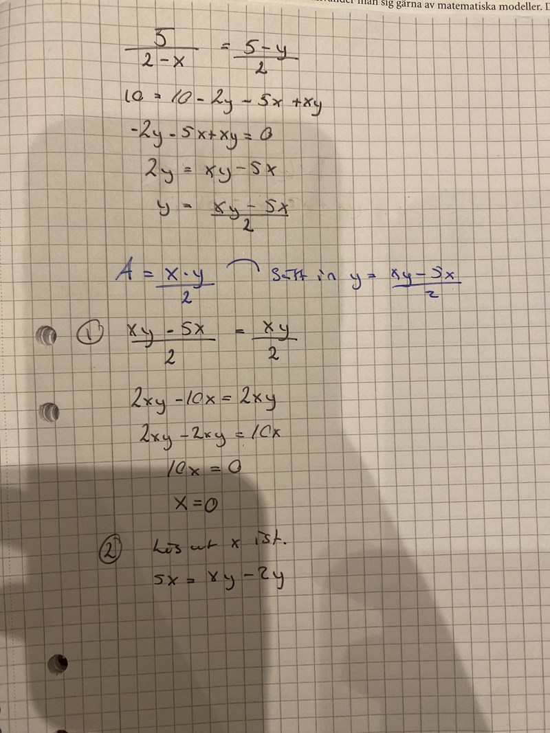 • Multiplicera båda leden i 52-x=5-y2\dfrac{5}{2-x} = \dfrac{5-y}{2} med (2-x)(2-x) och med 22: