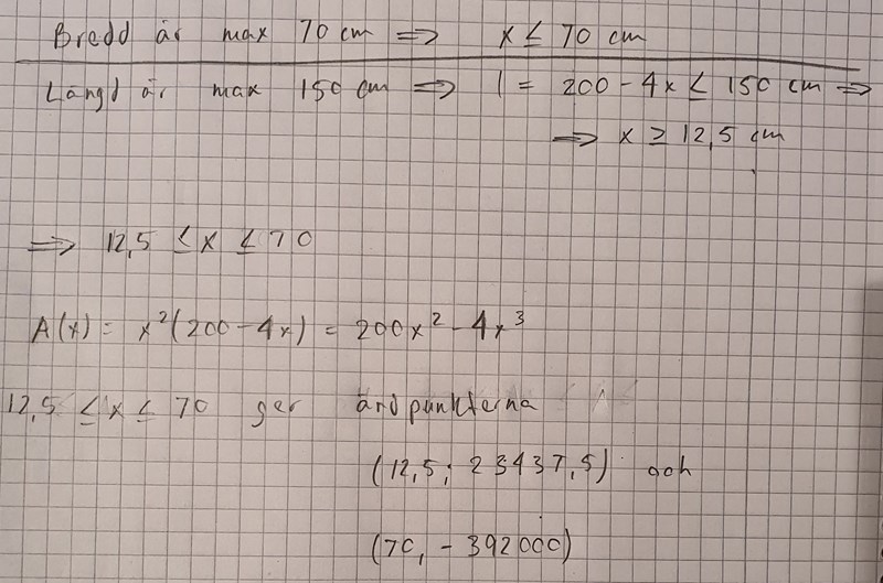 När jag löste uppgiften själv så tog jag hänsyn till att x är mindre eller lika med 70 cm. Samtidigt gäller att längden l = 200 - 4x är mindre eller lika med 150 cm. Med hjälp av denna information formulerade jag sedan ett intervall där funktionen A(x) gäller.