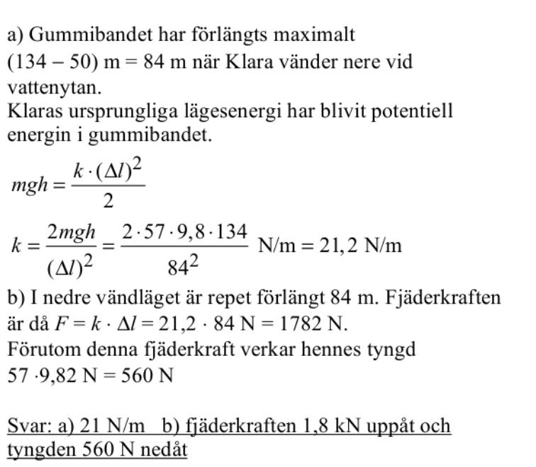 Lösningsförslaget räknar ut fjäderkraften enligt Hookes lag, 1,8 kN.