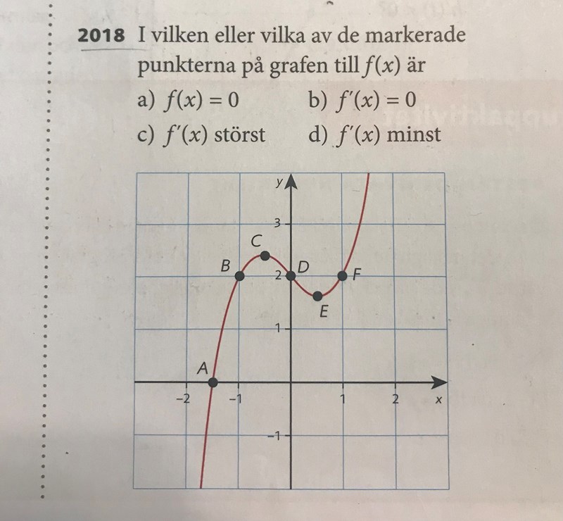 behöver hjälp på c, tänker att det ska vara punkt A eller F. Och att svaret ska bli den punkten som har tangenten som lutar mest om jag hade ritat tangenter till dom punkterna ??