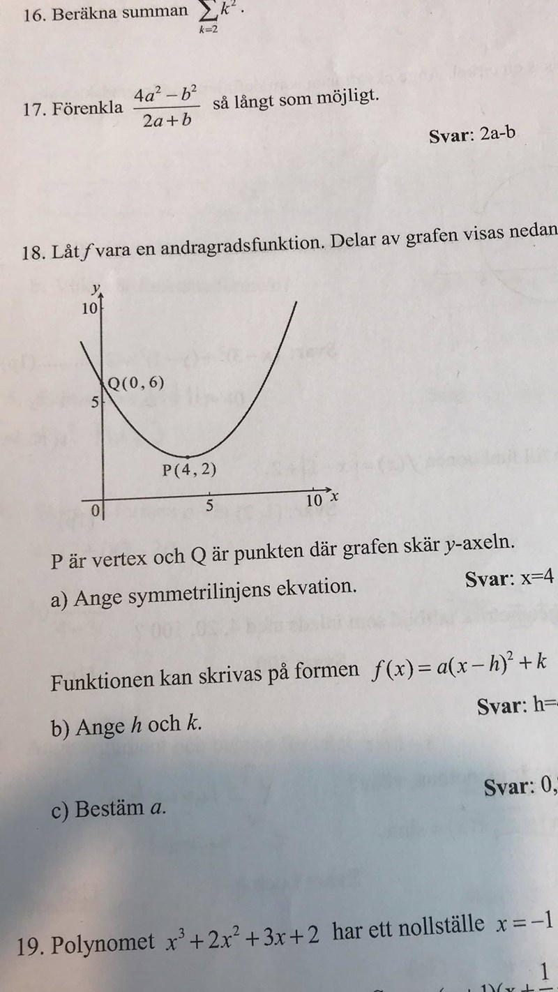 För sådana här uppgifter brukar det nämligen finnas en andragradsfunktion som du ska skriva på den där formen.