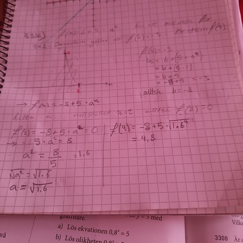 Ditt svar är rätt, men i uträkningen så missade du möjligheten att a=-1,6a=-\sqrt{1,6} och att det ska stå f(4)=-8+5·(1,6)4f(4)=-8+5\cdot (\sqrt{1,6})^4 istället för f(4)=-8+5·1,64f(4)=-8+5\cdot\sqrt{1,6^4}