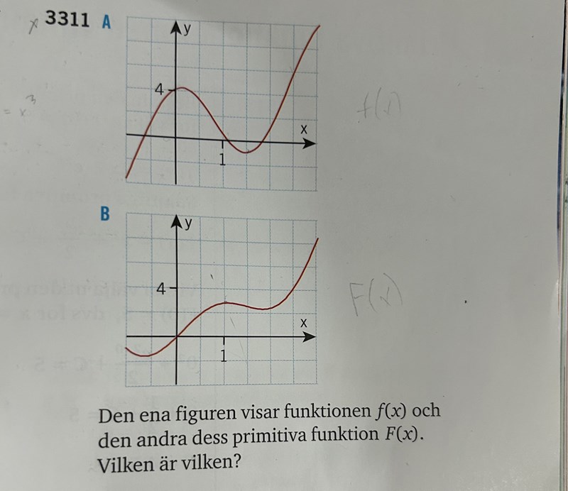 Ett sätt är att se att B aldrig är negativ för x>0. Hade B varit f(x) så hade A varit tvungen att ha en positiv lutning för x>0. Detta stämmer inte, alltså är B F(X).