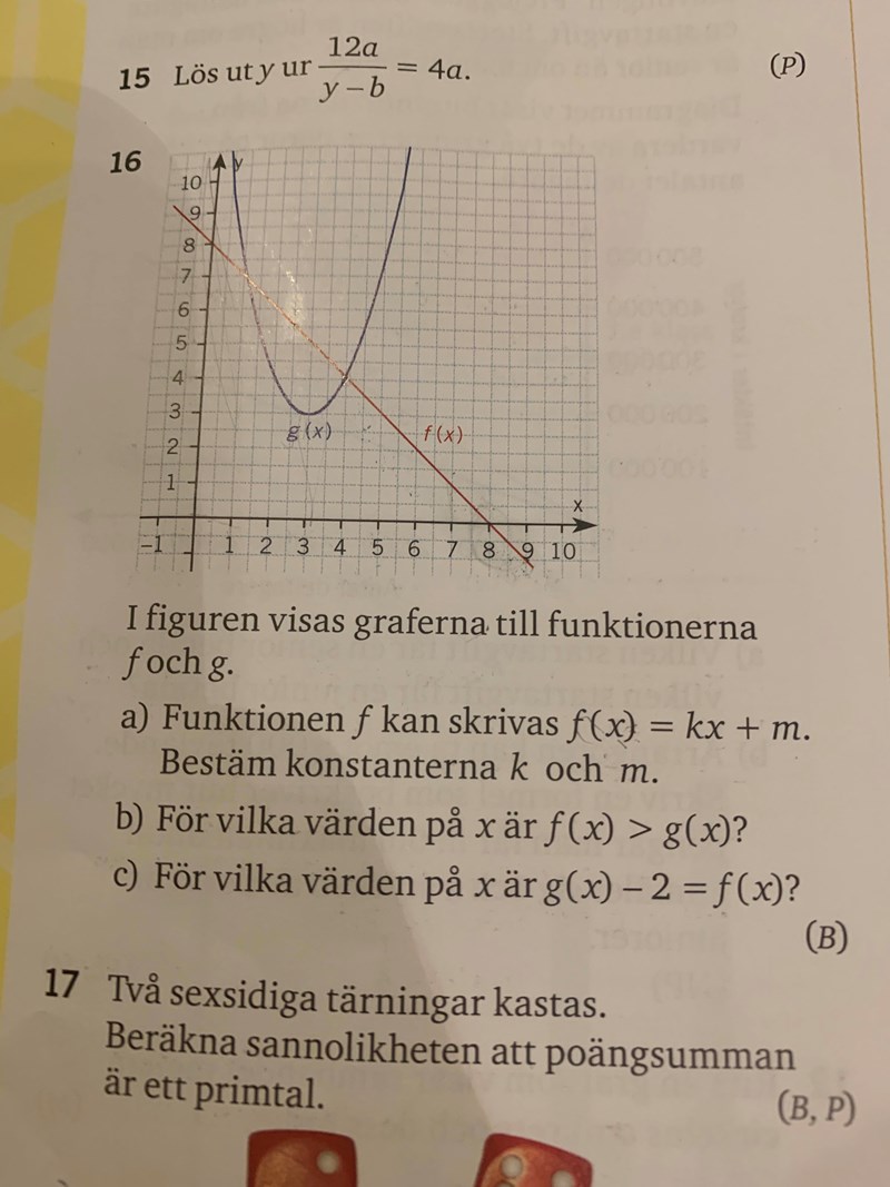 b) För vilka värden på x ligger den räta linjen högre upp än andragradskurvan?