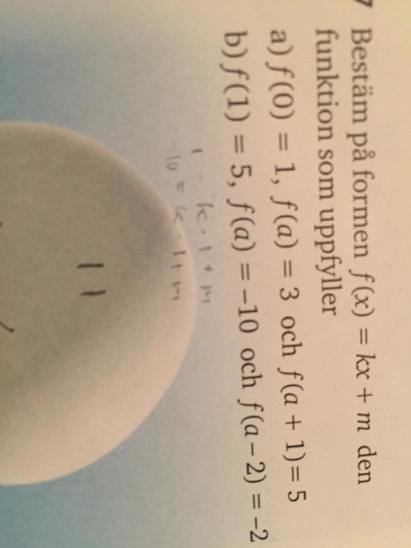 Du vet att f(a)=-10f(a)=-10 och att f(a-2)=-2f(a-2)=-2. Hur mycket är Δy=f(a)-f(a-2)\Delta y=f(a)-f(a-2)? (Det har du räknat ut.) Hur mycket är Δx=a-(a-2)\Delta x=a-(a-2)? Hur mycket är k=ΔyDeltaxk=\frac{\Delta y}{Delta x}? När du har fått fram ett värde på kk kan du sätta in det och koordinaterna (1,5)(1,5) som står i uppgiften och räkna ut m.