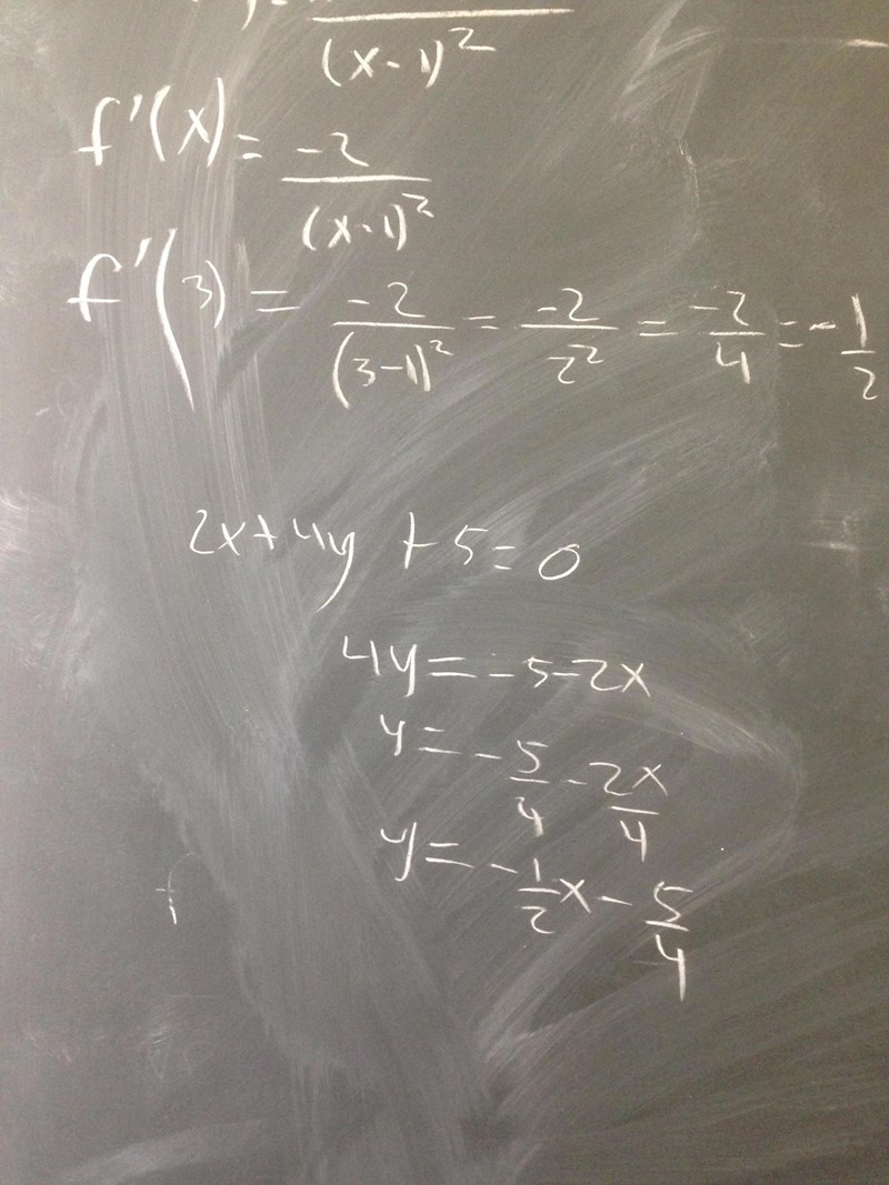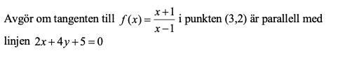 Nedan ser ni två bilder. Den första är min lösning. Den andra är f´(3). Det som jag tycker är knäppt här är att i min grafräknare ger f´(3) ett positivt värde=1/2. Medan jag i min uträkning får lutningen i punkten till samma värde fast negativt: -1/2. Hur kommer det sig att dessa skiljer sig åt? Varför detta bekymrar mig är för att jag vill kunna "dubbelkontrollera" mina svar grafiskt i räknaren. Som alltid tack för den tid ni tar till att hjälpa till!
