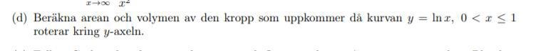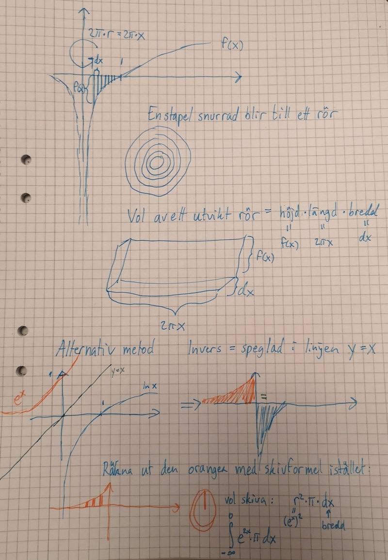 Enligt rörformeln är tydligen volymen av f(x) då den roteras runt y-axeln och eftersom är inversen skriver jag det istället som och detta ger 6.28 ish, känns som en magisk formeln så på något sätt låter det rimligt men det känns ändå att jag fuskar eftersom x>0 och jag stoppar fortfarande in 0 men e^x är ju inte odef för x = 0. Anledning till att jag bytte ut f(x) till inversen, alltså är tydligen för att man ska göra det.