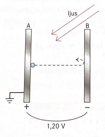 32b) Mellan de två metallplattorna A och B i figuren kan det elektriska fältet anses vara homogent. Genom att belysa platta A med starkt ljus kan man frigöra elektroner ur den. När spänningen mellan A och B är 1,20 V, når de snabbaste elektronerna nätt och jämnt fram till B för att sedan "falla" tillbaka mot A. Avståndet AB är 1,5 cm.