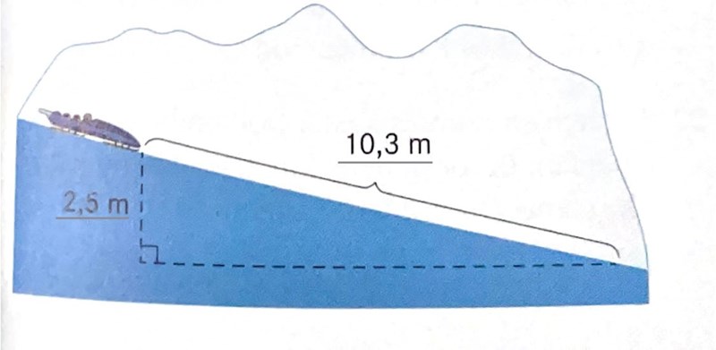13) En bob med massan 620 kg åker nedför en bana. Figuren visar en del av banan som inte innehåller några svängar. Här håller bobben den konstanta hastigheten av 125 km/h. Bortse från friktionen mot isen och bestäm luftmotståndet på bobben i denna del av banan.