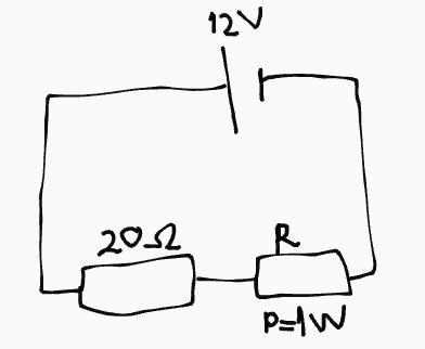Största effekten i motståndet fås om man väjer 20 Ω, men då blir effekten 6•6/20 dvs 1,8 W vilket är för stort. För lägre effekter blir det två lösningar.