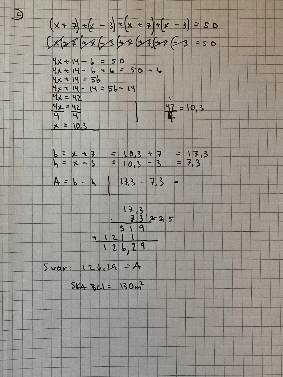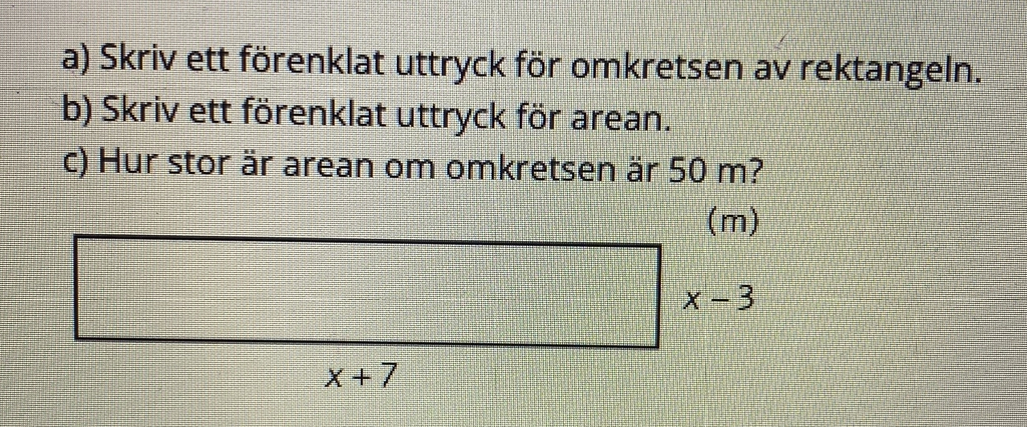 a) och b) uppgifterna löste jag, där hade jag en bild, på en rektangel med måtten: b= x+7 och h= x-3