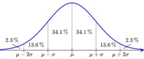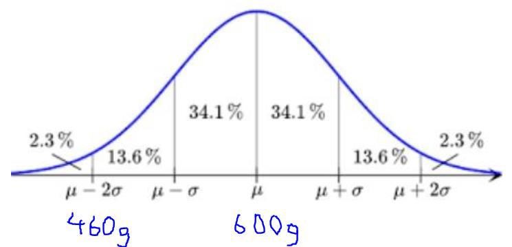 Om medelvikten är 600 g så kommer 50 % väga över 600 g, 84,3 % kommer att väga mer än 530 g (gränsen för en standardavvikelse) och 97,7 % kommer att väga mer än 460 g (gränsen för en standardavvikelse från medelvärdet).