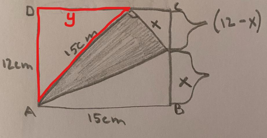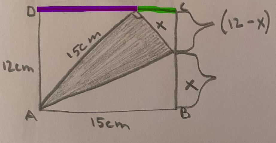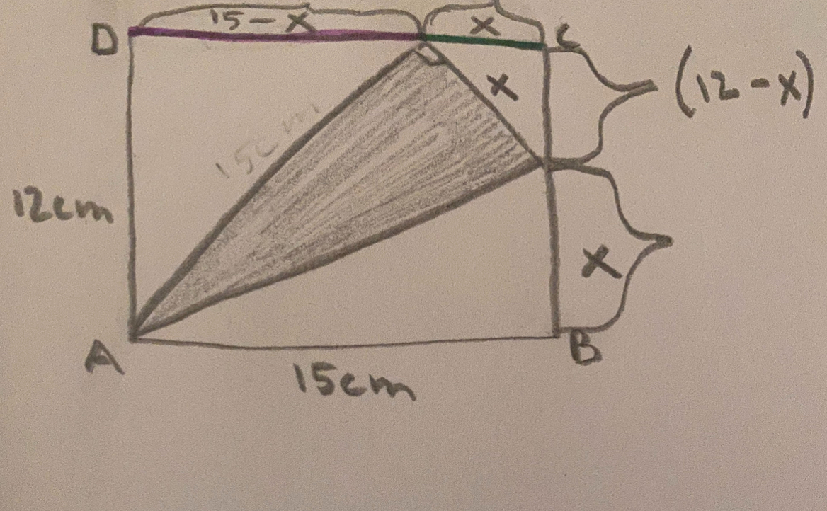 12^2 + (12-x)^2 =15^2 för att få fram x? Men de här känns fel?