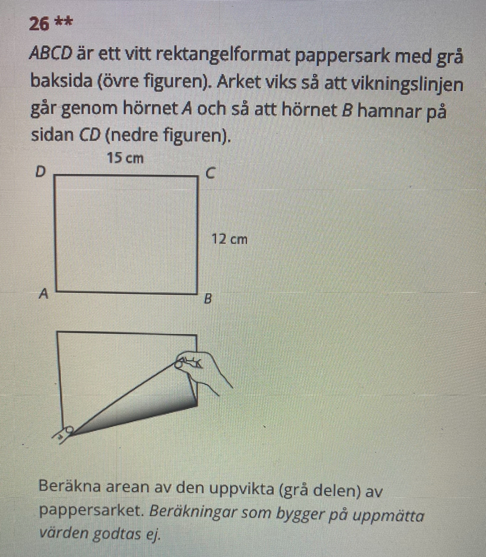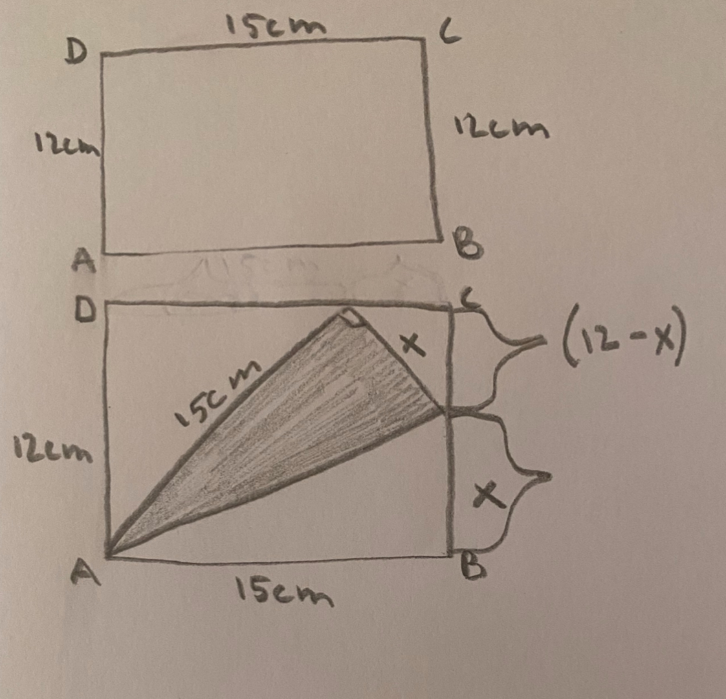 först tänkte jag att jag kunde ta hjälp av Pythagoras sats, men blir osäker på hur det skulle se ut. Jag känner ju inte till 2 sidor på triangeln den ena sidan är 15 & den andra sidan är x? Så det blir svårt att använda Pythagoras då, jag har dock 12cm och 15cm i rektangeln så för att få fram x tänker jag väl att jag kanske kan sätta in rektangelns värden i satsen typ: