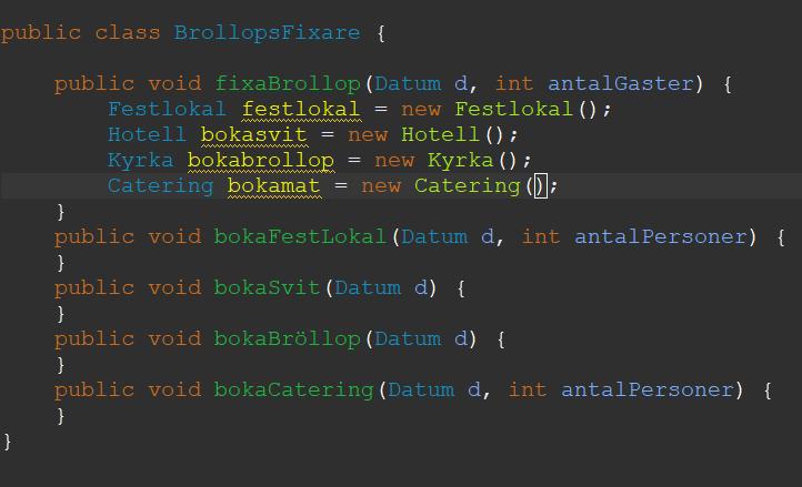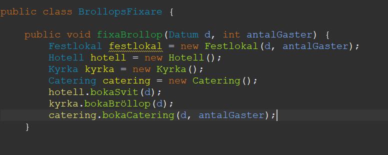 I det enklaste fallet: det finns bara en lokal som rymmer x personer, ett hotell med y rum, en kyrka och en catering firma med standardmat så ropar du bara fixaBrollop med olika datum och antal gäster - det är vad en klient skulle göra. Sen får du hålla reda på vad som redan är bokat, hur många lediga rum som finns på hotellet vid bokningsdatumet och andra saker, sen returnerar du olika felmeddelanden beroende på om lokalen är för liten, kyrkan redan bokad, inte nog med lediga rum på hotellet osv.