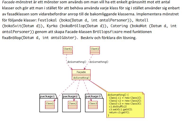 klienten ropar BröllopsFixare.bokaBröllop(datum); som då internt hanteras i någon klass för detta ändamål, sen ropar klienten BröllopsFixare.bokaSvit(datum) som kanske hanteras av en annan klass. med andra ord, klienten pratar bara med fasaden och vet inte/bryr sig inte hur implementationen ser ut bakom fasaden.